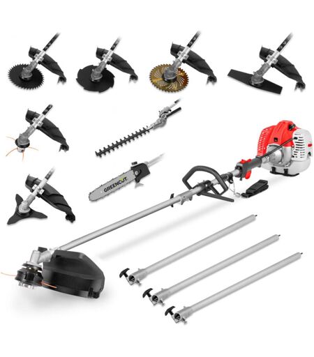 GREENCUT Outil multifonction 65cc 4,9cv avec moteur à essence 2 temps , 9 accessoires différents pour la coupe, guidon à double poignée, harnais de sécurité
