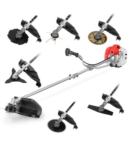 GREENCUT Débroussailleuse à essence 65cc 4,9cv, avec moteur 2 temps, 7 accessoires différents pour la coupe, guidon à double poignée, régulateur de puissance,