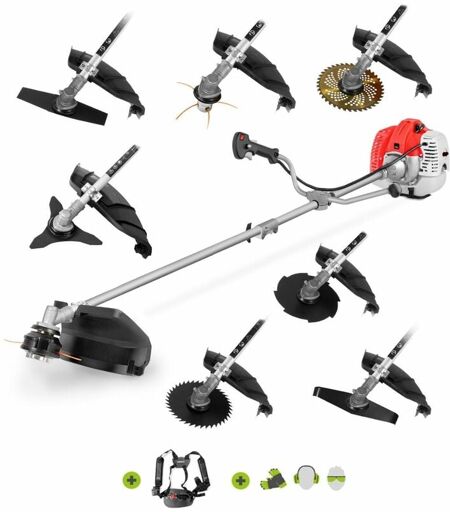 Débroussailleuse à essence 65cc 4,9cv, moteur 2 temps, 8 accessoires, guidon double poignée, régulateur puissance, harnais sécurité - Greencut