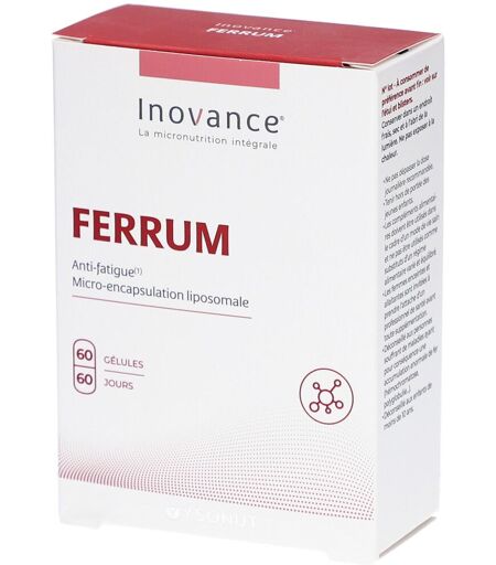 Complément alimentaire à utiliser dans le cadre d'une alimentation variée, équilibrée et d'un mode de vie sain.Ferrum de Inovance® est un complément alimentaire à base de fer sous forme de pyrophosphate ferrique liposomal et de vitamine C.Il es indiqué en cas de fatigue persistante, d'essoufflements, de règles abondance et de taux de fer bas.Hautement assimilableAbsence de goût ferreuxNon irritant, non constipantNon oxydantSans allergène100% VEGANComposition :agent de charge : cellulose microcristalline ; Lipofer® (amidon de maïs, diphosphate ferrique (pyrophosphate ferrique), antiagglomérant : lécithines de tournesol) ; acide L-ascorbique (Vitamine C) ; agent d'enrobage : hydroxypropylméthylcellulose ; antiagglomérants : sels de magnésium d'acides gras, talcValeur nutritionnelle : Pour 1 géluleAJR*Fer14 mg100 %Vitamine C150 mg187,5 %* Apports journaliers de référenceConseils d'utilisation :1 gélule par jour, au cours d'un repas, à avaler avec un grand verre d’eau, ou selon conseil d’un professionnel de santé.Précautions d'emploi :Ne pas dépasser la dose journalière recommandée. Tenir hors de portée des enfants. Les femmes enceintes et allaitantes sont invitées à prendre l’attache d’un professionnel de santé avant toute supplémentation.Poids net :38,7 g = 60 capsules végétariennesFabricant :Laboratoires YsonutBP 29 008 Cedex 966 963 PerpignanFrance ...