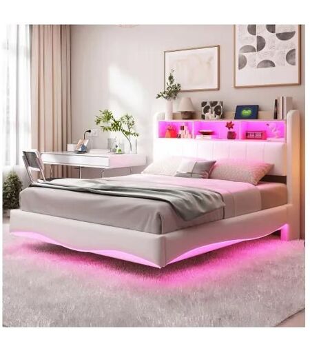 Lit flottant au design élégant et incurvé : le concept de design du lit flottant rembourré ajoute un cadre de lit unique et incurvé. Un look stylé et moderne qui augmente l'effet général de la chambre. Bandes lumineuses LED changeant de couleur à la tête de lit et au lit : les bandes lumineuses LED réglables créent une atmosphère adaptable et un environnement de chambre à coucher relaxant. Assure un sommeil réparateur Connexions USB et Type-C pratiques : Les ports USB à chargement rapide et de type C intégrés de ce lit moelleux garantissent un chargement rapide et facile des appareils directement depuis le lit. Espace de rangement à la tête de lit : L'espace de rangement supplémentaire à la tête du lit permet d'organiser les livres, les gadgets et les effets personnels. Tissu en lin résistant aux taches et à l'usure et cadre métallique solide : Ce lit rembourré est doté d'un tissu en lin agréable pour la peau, qui résiste aux taches et à l'usure, et d'une structure de soutien métallique solide, qui offre une excellente stabilité et une grande longévité, pour que vous puissiez dormir tranquillement. ...