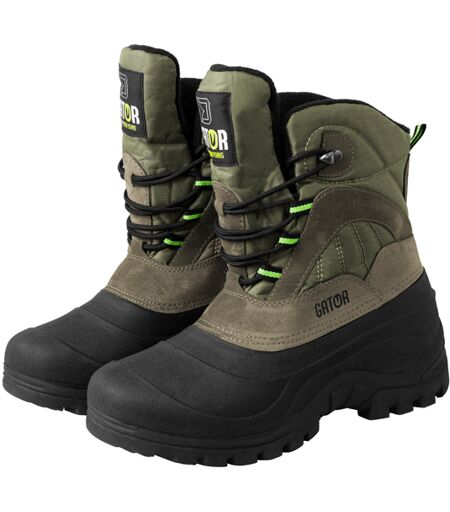 Les chaussures Delphin GATOR sont idéales pour les expéditions plus extrêmes dans les saisons froides. La bordure élevée en caoutchouc est au niveau de la cheville ; les flaques d'eau ou la neige fondue ne sera aucun problème pour GATOR. En plus, cette partie est très facile à nettoyer. Les chaussures GATOR ont aussi les ergots aux talons pour se débotter plus facilement. Le reste de la chaussure est en combinaison d'un tissu nylon et cuir artificiel. Ces matières sont durables et faciles à imprégner. La languette est cousue jusqu'à 17 cm de la taille de chaussure pour vous permettre de marcher même dans les eaux plus profondes pour quelques moments. Le système d'attache des lacets a des œillets et un anneau métallique en haut. L'intérieur est en micro laine polaire. Le confort absolu est assuré par la couche en microfibre synthétique entre la couche externe et interne. Ses qualités sont idéales pour les pêcheurs, chasseurs et pour tous qui aiment les randonnées dans la nature. Malgré leur apparence, elles sont assez légères et ne fatiguent pas vos pieds. Une paire des chaussures taille 43 pèsent seulement 1 200 g. ...