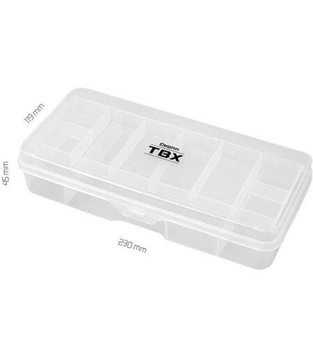 TBX ONE est une série des boîtes multifonctionnelles pour déposer vos accessoires de pêche. Elle est en plastique transparent pour que vous sachiez exactement où se trouvent vos affaires. Une boîte possède aussi des clips plastiques en extérieur. Informations techniques : Dimensions : 230x119x45 mm Nombre de compartiments (boîte) : 11 Dimensions d'un compartiment : 1x(13,5x10,1x1,8 cm),2x(4,2x10,1x1,8 cm),4x(3,5x6,8x1,5 cm),4x(3,5x3,5x1,5 cm) Le nombre des compartiments insérés : 0 ...