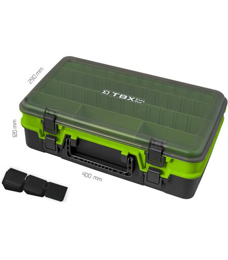 Delphin TBX EasyDuo est une boîte pratique avec la prise semblable au celle d'une mallette et avec deux compartiments séparés. Il est possible de la porter comme une mallette. Il sert très bien pour déposer les leurres et d'autres accessoires de pêche. Le sac a des clips par lesquels il est possible d'ouvrir les compartiments. Ils sont en couleur noire et vert clair et le couvercle en gris transparent. Informations techniques : Dimensions : 400x290x120 mm Nombre des compartiments (boîte) : 10 Dimensions d'un compartiment : 1x(36x19x6,5 cm), 3x(36,5x6x5 cm), 3x(12x6x5 cm), 3x(12x6x6,5 cm) Le nombre des compartiments insérés : 17 ...