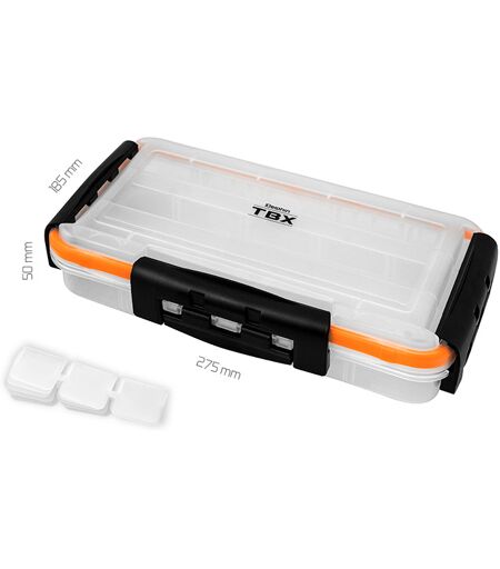 TBX ONE Clip WP est une série des boîtes multifonctionnelles pour déposer vos accessoires de pêche. Elle est en plastique transparent pour que vous sachiez exactement où se trouvent vos affaires. Une boîte possède aussi des clips plastiques en extérieur et le joint caoutchouc orange. Informations techniques : Dimensions : 275x185x50 mm Nombre des compartiments (boîte) : 3 Dimensions d'un compartiment : 24,5x4,5x3,3 cm Le nombre des compartiments insérés : 10 ...