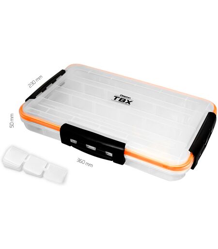 TBX ONE Clip est une série des boîtes multifonctionnelles pour déposer vos accessoires de pêche. Elle est en plastique transparent pour que vous sachiez exactement où se trouvent vos affaires. Une boîte possède aussi des clips plastiques en extérieur et le joint caoutchouc orange. Informations techniques : Dimensions : 360x230x50 mm Nombre des compartiments (boîte) : 4 Dimensions d'un compartiment : 32,5x4,5x3 cm Le nombre des compartiments insérés : 19 ...