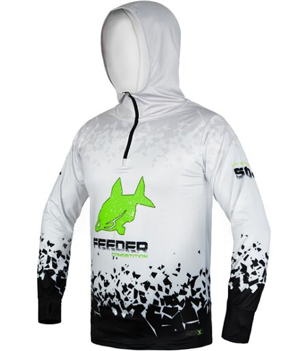 Un T-shirt à capuche Delphin UV ARMOR 50+ vous protège contre le rayonnement solaire pendant les chauds jours d'été. Il est conçu notamment pour les fans de la technique feeder grâce à son design Reaxe. La matière UPF 50+ protège la peau sensible et la rafraîchit. Nous avons bien pensé à la protection de tête. Ce T-shirt a un col haut, une capuche et des manches longues avec les passe-pouces. Ce type de matière agréable et élastique sèche rapidement. Le T-shirt et le dessin imprimé sont de haute qualité. Disponibles dans une large gamme de tailles pour choisir la bonne pour vous (S – XXXL). Le design est blanc avec des couleurs gris et noir avec un dessin vert de la brème. Composition : 90% polyester, 10% élasthanne ...