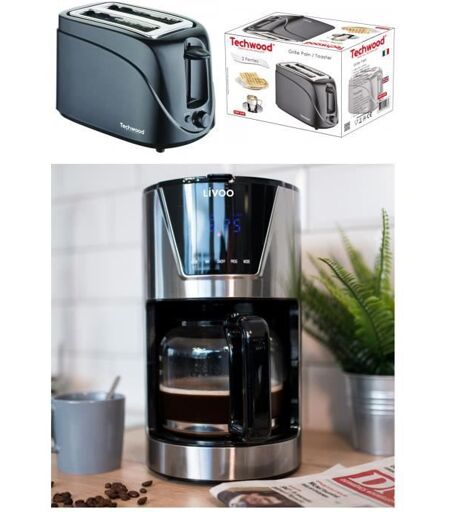 Techwood Cafetière Machine À Café Programmable Inox 1.5l 900w + Grille Pain 2 Fentes 700w Ejection Automatique Ou Manuel