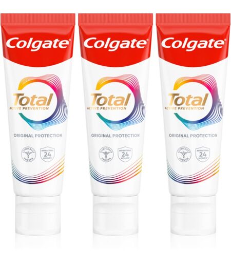 Colgate Total Original, 3x75 ml, Dentifrices mixte, Le dentifrice Colgate Total Active PreventionOriginal assure un soin complet de vos dents et de vos gencives. Il nettoie la plaque dentaire et les restes d’aliments de vos dents, il prend également soin de la gencive et des muqueuses buccales. Le produit : nettoie parfaitement les dents limite la formation de plaque dentaire Mode d’emploi : Nettoyez vos dents au moins 2 x par jour avec une brosse de qualité. Appliquez une quantité raisonnable de dentifrice sur la brosse à dents et nettoyez les dents pendant au moins 2 minutes. Rincez ensuite parfaitement votre cavité buccale. ...