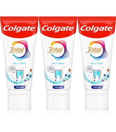 Colgate Total Junior, 3x50 ml, Dentifrice pour enfants pour enfant, Le dentifrice Colgate Total Junior Active PreventionMild Mint assure un soin complet de vos dents et de vos gencives. Il nettoie la plaque dentaire et les restes d’aliments de vos dents, il prend également soin de la gencive et des muqueuses buccales. Le produit : prend soin des gencives nettoie parfaitement les dents élimine la plaque dentaire renforce l’émail dentaire protège efficacement les dents Mode d’emploi : Déposez du dentifrice sur la brosse à dents et brossez en effectuant de petits mouvements circulaires. ...