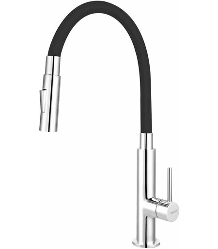 Robinetterie d’évier avec douchette couleur : noir/chrome hauteur de la robinetterie : max. 420 mm longueur du bec : max 410 mm type de mitigeur sur plage avec bras flexible Flexi avec mousseur inverseur Slim 2 jets : normal/douche cartouche en céramique 25 mm mitigeur fourni avec flexibles d’alimentation ...