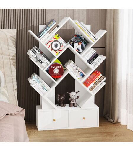 Skecten - Bibliothèque en Forme d'arbre, Bibliothèque à Poser au Sol avec Tiroirs, Etagère pour Salon, Maison, Bureau, Blanc
