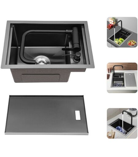Description Que faire si l'on manque de place dans l'évier de la cuisine ? Que faire si l'évier est toujours bouché et ne peut pas être nettoyé tout le temps ? Je vous suggère de jeter un coup d'œil à notre évier de cuisine doté d'un excellent matériau et de fonctions de nettoyage faciles, qui peut facilement résoudre les problèmes susmentionnés et vous aider à créer une cuisine plus ordonnée. Caractéristiques principales Durable : Fabriqué en acier inoxydable avec un procédé de peinture au four nanométrique, il n'est pas facile à décolorer et peut résister à l'usure, à la corrosion, à la rouille, aux chocs et à la déformation, de sorte qu'il peut rester beau et pratique à l'intérieur. Un design bien pensé : Le fond incliné avec un grand trou de drainage et une ligne d'écoulement en forme de X permet à l'eau de s'écouler rapidement vers le drain, de sorte que l'eau ne s'accumule pas au fond de la cuvette. En outre, un revêtement anti-moisissure au fond de l'évier empêche la rétention ...