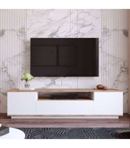 Description générale Le meuble TV LOTULA est l'élément indispensable pour votre salon. Avec son design moderne et élégant, il offre un espace de rangement optimal grâce à ses trois portes et sa niche, tout en apportant une touche esthétique à votre intérieur. Spécifications techniques Matériau : Panneau de particules 100 % mélaminé Épaisseur : 18 mm Couleur : Blanc et Naturel clair Dimensions : Longueur 180 cm, Hauteur 44,6 cm, Profondeur 44,5 cm Poids net : 39,28 kg Charge maximale supportée par le plateau TV : 20 kg Charge maximale supportée par la niche : 20 kg Charge maximale supportée par les étagères : 20 kg Compatibilité et accessoires Ce meuble TV est conçu pour s'adapter à la plupart des télévisions de taille standard et peut être complété avec des accessoires de rangement pour optimiser l'espace. Installation Le meuble est livré en kit avec des instructions claires pour un assemblage facile. Tout le matériel nécessaire est inclus, ce qui permet une installation rapide. ...