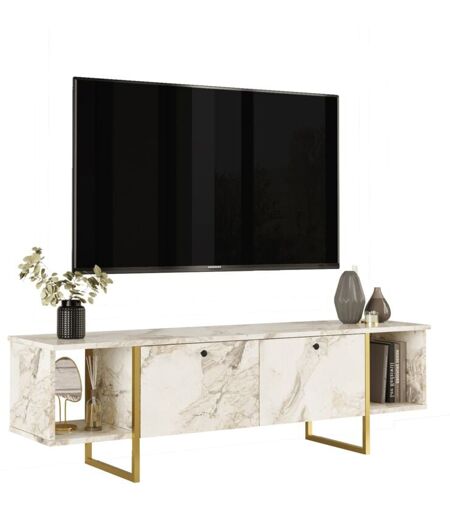 Cotecosy - Meuble tv 2 portes et 2 étagères - Effet marbre blanc et Doré - derana