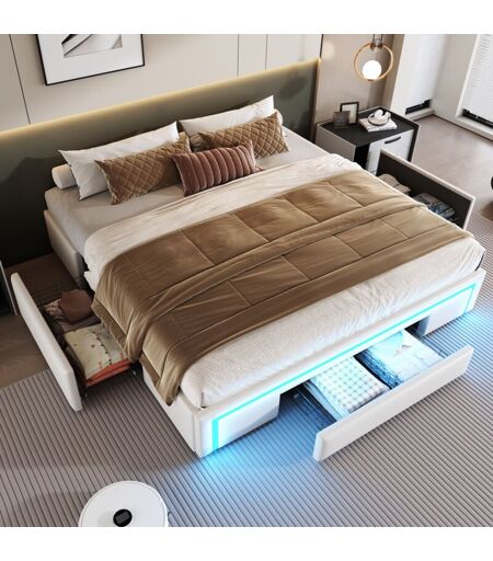 Design Élégant et Moderne : Ce lit doppel 180x200 cm, recouvert de cuir PU de haute qualité, apporte une touche de luxe et d'élégance à toute chambre moderne. Facile à entretenir, il combine esthétique et fonctionnalité avec un entretien minimal. Espace de Rangement Intégré : Profitez de 3 tiroirs pratiques intégrés pour ranger vos vêtements, literie et accessoires, offrant un espace de rangement supplémentaire tout en optimisant l'utilisation de l'espace dans votre chambre. Barre LED RGB : La barre LED située au pied du lit change de couleur et crée une ambiance lumineuse idéale pour des soirées détendues ou pour lire tard dans la nuit, ajoutant une touche chaleureuse à votre chambre. Cadre en Métal Robuste : Ce lit est soutenu par un cadre métallique stable avec un système de lattes métalliques, capable de supporter un poids allant jusqu'à 350 kg. Il assure ainsi un sommeil sûr et stable tout en étant adapté à des matelas de 22 à 25 cm de hauteur. Spécifications : Dimensions du ...