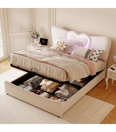 TANANT Lit coffre 140x200 cm, sommier à lattes, avec port de chargement USB, Stockage, tête de lit coeur éclairée LED, velours, design moderne, Beige