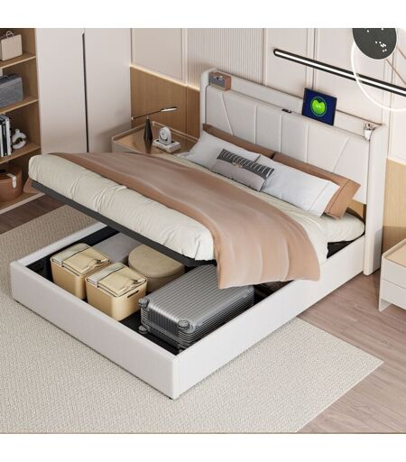 TANANT Lit coffre 140x200 cm, avec 2 ports USB et 1 port de charge Tyce, tête de lit rayée, sommier à lattes, design moderne, lin, Beige