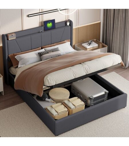 TANANT Lit coffre 140x200 cm, avec 2 ports USB et 1 port de charge Tyce, tête de lit rayée, sommier à lattes, design moderne, lin, Gris