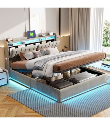 TANANT Lit coffre 140x190 cm, lit 140x190, tête de lit capitonnée avec LED intégrée et port de charge USB, sommier à lattes, rangement, velours, design, Gris
