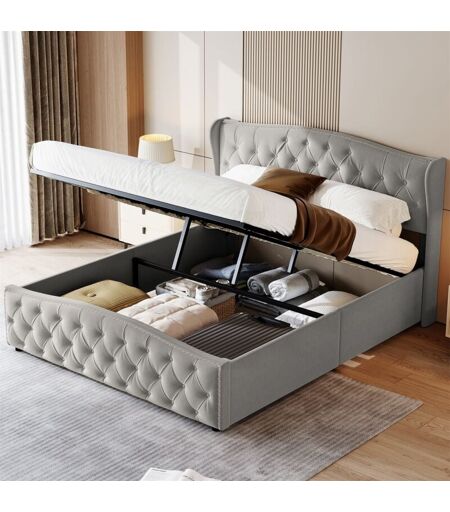 DANS LES NUAGES Lit coffre 160x200 cm, tête de lit ondulée avec garniture rivetée, rangement hydraulique, flanelle, sommier à lattes, adapté aux adultes et