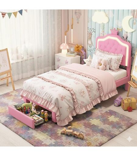 DANS LES NUAGES Lit simple 90x200 cm, avec tête de lit LED, boutons en forme de couronne, 2 tiroirs, tissu simili-cuir, sommier à lattes, pour adulte, adolescent et