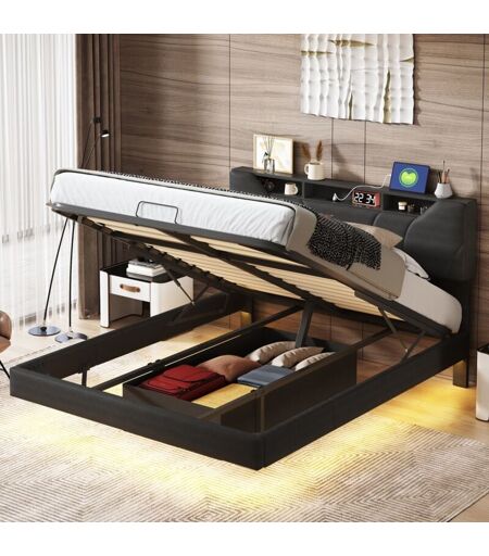 DANS LES NUAGES Lit coffre 140x190 cm, avec tête de lit rangement LED, chargement USB, rangement hydraulique, design suspendu, adapté aux adultes et adolescents