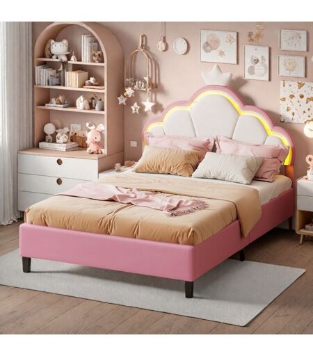 DANS LES NUAGES Lit simple 90x200 cm, tête de lit décor couronne, bandeau lumineux LED, sommier à lattes, velours, lit princesse enfant - Rose