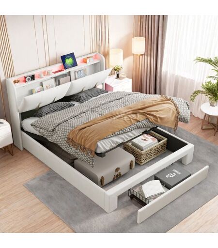 Conception de stockage de tige de pression d'air : ce lit est équipé d'une fonction de stockage de tige de pression. Il fournit un espace de stockage caché de grande capacité sous le cadre du lit, ce qui est pratique pour ranger les vêtements saisonniers, la literie et d'autres articles, maximisant l'utilisation de l'espace de la chambre. et garder la pièce bien rangée. Matériau de velours luxueux : le lit est fabriqué en velours beige, doux et confortable au toucher et de texture haut de gamme, donnant à la chambre un tempérament élégant tout en offrant une excellente expérience de confort. Conception de bande lumineuse colorée : le chevet est équipé d'une bande lumineuse colorée réglable. Les utilisateurs peuvent régler la luminosité et la vitesse de changement de lumière en fonction des besoins pour créer différentes atmosphères, à la fois pratiques et technologiques. Fonction de charge pratique : le chevet a une fonction de charge intégrée, fournissant deux ports de charge USB et ...