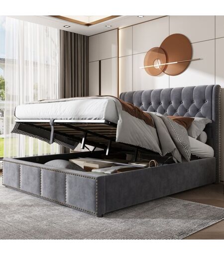 DANS LES NUAGES Lit coffre double 160x200 cm, tête de lit prismatique boutonnée, avec bordure rivetée, rangement amélioré hydraulique, velours, style minimaliste