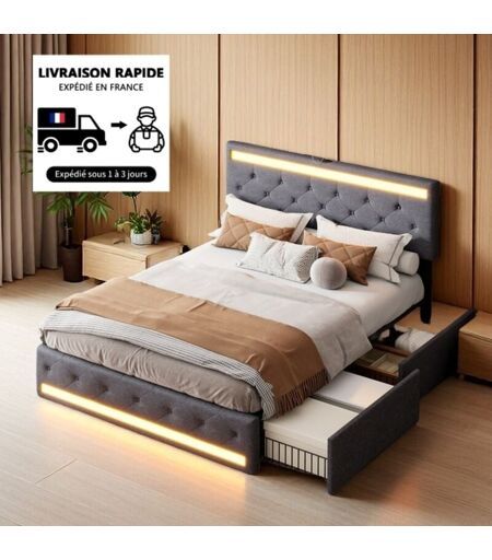 DANS LES NUAGES Lit double 160x200 cm, lit adulte avec tête de lit LED réglable, 4 tiroirs, port de charge USB et Type-C, linge de maison, sommier à lattes, lit