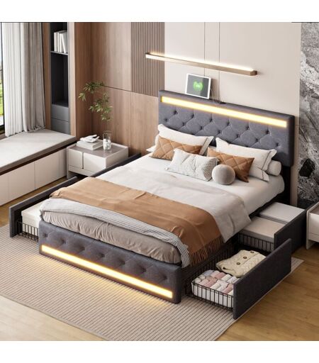 DANS LES NUAGES Lit 140x190 cm, avec 4 tiroirs, tête de lit LED réglable, chargement USB et Type-C, sommier à lattes, structure en métal, convient aux adultes et