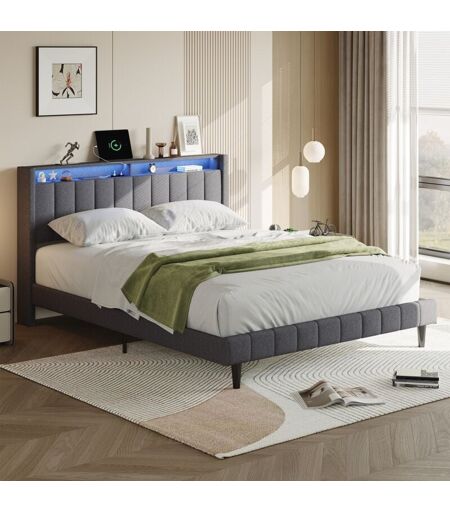DANS LES NUAGES Lit double capitonné 160x200 cm avec éclairage LED et chargement USB, tête de lit avec rangement, sommier à lattes, en lin, adapté aux adultes,