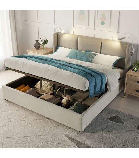 FORTUNA LAI Lit coffre 160x200 cm avec rangement, lit double adulte avec sommier, avec chargement USB, avec liseuse, lin - Beige