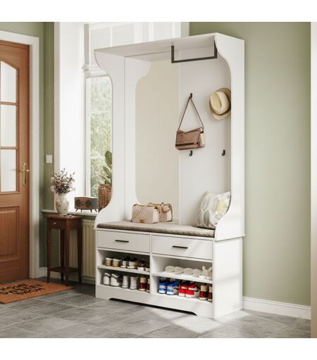 LA SOLUTION TOUT-EN-UN POUR VOTRE ENTRÉE : Ne cherchez plus ! Ce meuble combine 5 fonctions essentielles : un banc confortable avec coussin, un grand rangement à chaussures, un porte-manteau, une penderie et un miroir intégré. Votre entrée sera toujours parfaitement organisée et accueillante. UN MAXIMUM DE RANGEMENT ASTUCIEUX : Chaque chose trouve sa place. Rangez les chaussures de toute la famille dans les nombreuses niches, suspendez manteaux et sacs aux 4 crochets robustes, utilisez la barre de penderie pour vos vestes et cachez clés et courrier dans les 2 tiroirs spacieux. ÉLÉGANCE ET CHARME INTEMPORELS : Avec son design inspiré des maisons de campagne, sa corniche délicatement travaillée et sa finition blanche lumineuse, ce vestiaire n'est pas seulement pratique, c'est une véritable pièce de décoration qui sublimera votre entrée. PENSÉ POUR LE QUOTIDIEN : Asseyez-vous confortablement sur le banc pour vous chausser. Jetez un dernier coup d'œil à votre tenue dans le miroir avant de ...