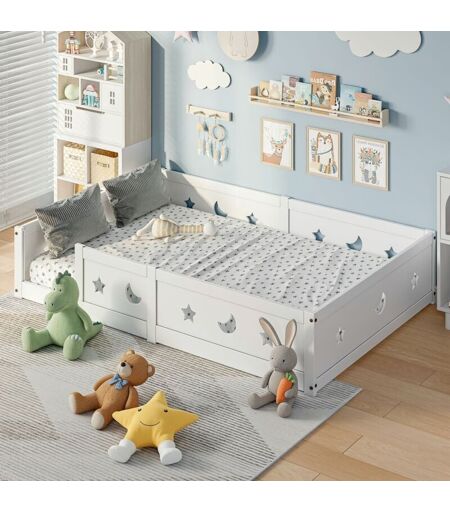 🌲 Matériaux de qualité : Fabriqué en pin massif, ce lit est peint avec une peinture écologique et sans odeur, adaptée aux enfants, résistante aux éclaboussures et à la salive 🛡️ Fonction de sécurité anti-chute : Conçu avec des barrières de protection pour empêcher les chutes, offrant ainsi une sécurité optimale pour les enfants pendant leur sommeil 🌙 Motifs décoratifs étoiles et lune : La barrière du lit est ornée de jolis motifs combinant des étoiles et des lunes, ajoutant une touche de magie à la chambre de votre enfant 🛏️ Base à lattes pour un meilleur soutien : La base à lattes assure une ventilation optimale du matelas et un soutien fiable pour un sommeil confortable et réparateur 🎨 Design simple et élégant : Le coloris blanc s’intègre parfaitement à tous les styles de décoration, apportant une ambiance douce et apaisante dans la chambre de l'enfant Spécifications : Dimensions totales : 206 x 145 x 41,5 cm Dimensions du matelas compatible (non inclus) : 90 x 200 cm Poids : ...