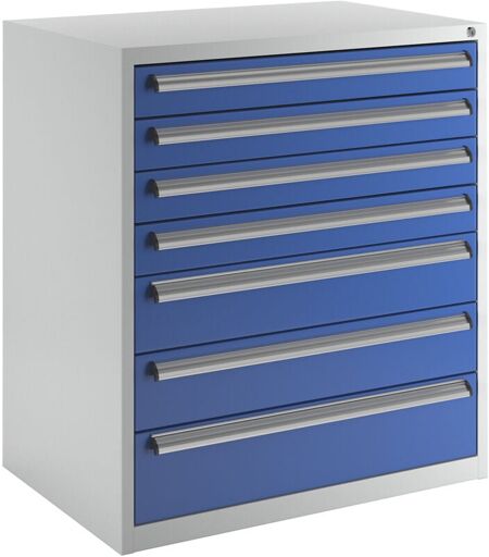 Armoire à outils, largeur 900 mm, hauteur 1000 mm, tiroirs: 4 x 100, 2 x 150, 1 x 200 mm. Produit livré = monté. Hauteur = 1000 mm. Largeur = 900 mm. Profondeur = 600 mm. Nombre de tiroirs = 7 pces. Hauteur tiroirs = 4x100, 2x150, 1x200 mm. Charge max. par tiroir = 35 kg. Ouverture tiroirs = 100%. Glissière de tiroir = tiroirs télescopiques coulissant sur roulement à billes. Verrouillage = verrouillage central par serrure à cylindre. Propriété = inscriptions possibles. Matériau = acier, peint époxy. Coloris corps = gris clair RAL 7035. Coloris façade = bleu gentiane RAL 5010. Tiroirs entièrement extractibles sur glissières télescopiques fluides. Profilés de poignée en alu avec possibilité de marquage. Serrure à cylindre avec verrouillage central. Solution de rangement fiable pour atelier et stockage : L'armoire à outils eurokraft basic convainc par sa construction robuste en acier et son équipement bien pensé. Avec 100 % de tiroirs extensibles sur des glissières télescopiques à ...