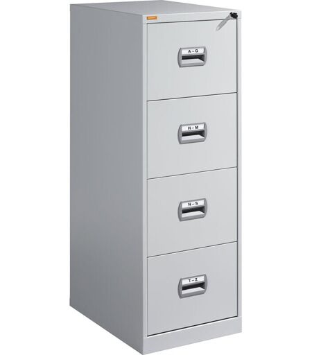 Classeur pour dossiers suspendus, 1 rangée, 4 tiroirs, gris clair. Produit livré = monté. Hauteur = 1296 mm. Largeur = 467 mm. Profondeur = 618 mm. Type de produit = classeurs pour dossiers suspendus. Matériau = tôle d'acier, peinte époxy. Coloris corps = gris clair RAL 7035. Coloris façade = gris clair RAL 7035. Nombre de tiroirs pour dossiers suspendus = 4 pces. Modèle de tiroir pour dossiers suspendus = 1 rangée. Pour format papier = A4 horizontal. Extension tiroir pour dossiers suspendus = extraction complète. Glissière de tiroir = télescopique. Charge max. par tiroir = 40 kg. Dimensions intérieures des tiroirs = 275x387x570 mm. Verrouillage = verrouillage central par serrure à cylindre avec jeu de 2 clés différentes. Propriété = butée de fin de course, verrouillable. Hauteur du socle = 60 mm. Modèle poignées = cadre servant de poignée. Epaisseur du corps = 0.70 mm. Pour dossiers format A4. Corps en tôle d'acier peinte époxy épaisseur 0,7 mm. Tiroirs à fond plein, coulissant à ...