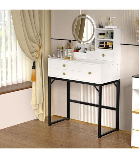 【Conception de charge élégante et pratique】- La belle coiffeuse blanche est équipée de lumières LED, qui mettent en valeur la beauté de votre pièce et semblent plus attrayantes. Grâce à la conception mise à jour, équipée de 2 prises standard et de 2 ports USB, vous pouvez facilement utiliser le sèche-cheveux et le fer à friser devant le miroir et charger votre téléphone ou d'autres appareils mobiles tout en vous maquillant. 【Miroir intelligent tactile LED】——Cette coiffeuse est livrée avec un charmant miroir de maquillage doré avec lumière LED et 3 modes de couleur : jaune chaud, lumière naturelle et blanc brillant pour répondre à vos différents besoins, parfait pour la maison, le salon ou la diffusion en direct. 【ESPACE DE RANGEMENT AMPLE ET TAILLE COMPACTE】--Cette coiffeuse est livrée avec 5 étagères de maquillage, 2 étagères ouvertes pour le rangement latéral et 4 tiroirs sur le comptoir, offrant un grand espace de rangement pour votre maquillage, vos sèche-cheveux et suffisamment ...