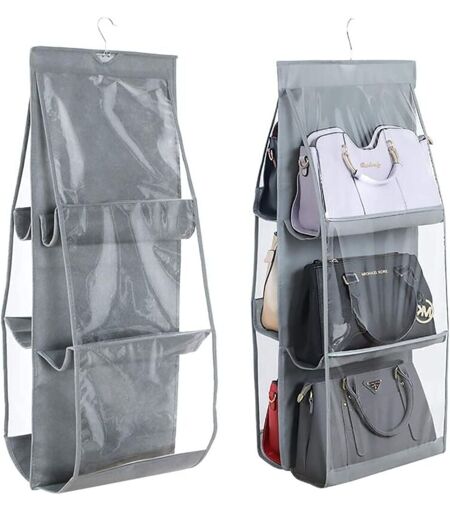 Matière : en tissu Oxford et PVC, robuste et durable, pliable pour un rangement facile. Taille : 35 x 83 cm / 13.8 x 32.7 pouces. Couleur : gris. CAPACITÉ : L'organisateur de sac à main a 6 poches, idéal pour économiser de l'espace. DESIGN HUMANISÉ : Le design double face permet d'économiser de l'espace et de ranger plus d'objets. Les crochets pivotants peuvent être facilement accrochés à des tringles ordinaires pour garder votre garde-robe ou votre armoire bien rangée. Peut ranger différents articles séparément, tels que des sacs à main, des chaussures ou même des vêtements. POSITION D'ACCROCHAGE : L'organisateur de sacs à main peut être accroché derrière la porte, convient à la chambre à coucher, au salon, à l'entrée ou à la buanderie, à la garde-robe et à l'armoire. ...