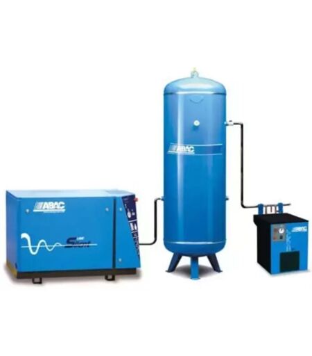 Compresseur d'air à piston complet ABAC. Compresseur d'une puissance de 5.5 CV avec un réservoir vertical de 500 litres. Ensemble complet peint + traitement l'air. Puissance : 5.5 CV triphasé 400V- 4 kW Capacité du réservoir : 500 litres vertical Vitesse de rotation : 1200 tr/min Débit engendré : 34,2 m3/h Pression : 11 bar Pression sonore : 67 dB(A) L'ensemble comprenant les éléments ci-dessous : Compresseur piston silencieux sur châssis Flexible de liaison de 2 m - 3/4" Réservoir vertical de 500 litres avec accessoires de contrôle et sécurité Sécheur par réfrigération. Débit traité de 45 m3/h type DY45 Kit by pass, tuyauteries de liaison 1/2", filtre micronique G90 et submicronique C90 Purge électrique 230V mono. ...