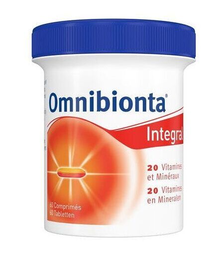 Complément alimentaire à utiliser dans le cadre d’une alimentation variée, équilibrée et d’un mode de vie sain.Pourquoi avons-nous besoin de vitamines et minéraux ?Vu l’abondance actuelle de nourriture, les carences en vitamines et minéraux devraient être rares. Néanmoins la manière dont on se nourrit n’est pas optimale : par ex. un régime alimentaire trop pauvre en fruits et légumes. Ou la mode de préparation est inadéquat : bien des vitamines sont dénaturées par le manque de fraîcheur des aliments ou par la cuisson. Et si notre organisme manque de vitamines et des minéraux, nous pouvons manquer de vitalité et d'énergie.La supplémentation vise à assurer un apport optimal en vitamines et minéraux lors de besoins accrûs: efforts physiques ou intellectuels, fatigue, convalescence ou en cas d’apport insuffisant: régime amaigrissant, alimentation déséquilibrée (écoliers, étudiants) ou insuffisante (personnes âgées).Un bon équilibre minéralo-vitaminique permet à l’organisme de bien utiliser les aliments pour produire de l’énergie et de résister à la fatigue. Les principes actifs d’Omnibionta Integral contribuent au métabolisme énergétique de votre corps grâce à la présence des vitamines B1, B2, B3, B5, B6 et B12. Les vitamines B2, B3, B5, B6, l’acide folique et le fer (un minéral) aident à combattre la fatigue passagère.Omnibionta Integral se compose de 12 vitamines, 8 minéraux et oligo-éléments spécifiquement choisis et doses pour ce bon équilibre minéralo-vitaminique. Tous ces éléments sont intégrés dans un nouveau type de comprimé : le duotab. Le duotab préserve la qualité de chaque vitamine et minéral qu’il contient. Sa forme est étudiée pour une ingestion aisée. Le duotab est très bien toléré au niveau de l’estomac et se digère facilement.IngrédientsAscorbate calcique ; Agent de charge : Cellulose microcristalline (E460i) ; Oxyde de magnésium ; Sulfate de fer ; Agent de charge : hydroxypropylméthylcellulose (E464) ; Nicotinamide ; Acétate de DL-a-tocophérol ; Agent de charge : Maltodextrine ; Antiagglomérants : Diglycérides d’acides gras (E471) (végétale) ; Agent d’enrobage : Hydroxypropylcellulose (E463) ; Agent de charge : Polyvinylpyrrolidone (E1201) ; Agent d’enrobage : Carboxyméthyl-cellulose de sodium réticulée (E468) ; Pantothénate calcique ; Oxyde de zinc ; Rétinylacétate ; Agent de charge : Polyvinylpolypyrrolidone (E1202) ; Antiagglomérants : Stéarate de magnésium (E470b) (végétale) ; Colorant : Oxyde de fer (E172) ; Sulfate de cuivre ; Nitrate de thiamine ; Riboflavine ; Sélénium de sodium ; Sulfate de manganèse ; Chlorhydrate de pyridoxine ; Gomme arabique (E414) ; Saccharose ; Amidon ; Acide folique ; Molybdate de sodium ; Triglycérides à chaîne moyenne ; D-Biotine ; Iodure de potassium ; Vitamine D3 ; Antioxydant: alfatocophérol ; Cyanocobalamine.Données nutritionnellesVitaminesPar compriméAR* (%)Vitamine A800 μg100Vitamine D5 μg100Vitamine E10 mg83Vitamine C180 mg225Thiamine (vitamine B1)2,8 mg255Riboflavine (vitamine B2)3,2... ...