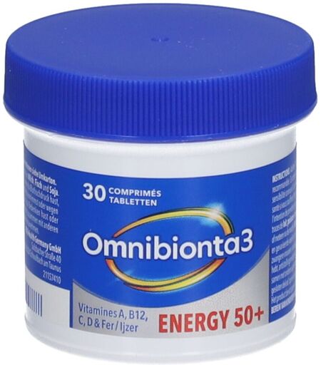 Complément alimentaire à utiliser dans le cadre d’une alimentation variée, équilibrée et d’un mode de vie sain.Gardez vos batteries chargées grâce à la formule Omnibionta3 Énergie1 50+ – Énergie1 qui vient de l’intérieur.Nous avons tous besoin d’énergie dans notre vie ! Toutefois, l’énergie vient de l’intérieur !La formule Omnibionta3 Énergie1 50+ a été spécialement conçue pour les adultes de plus de 50 ans avec une combinaison unique de minéraux et de vitamines pour favorise l’énergie mentale et physique1.Chaque comprimé contient 12 vitamines essentielles et 7 minéraux, notamment de la vitamine B12, B1, B2, B3, B5, B6 et B7 pour contribuer au bon métabolisme énergétique1, de la vitamine C et du fer pour aider à réduire la fatigue1, du zinc pour favoriser le fonctionnement cognitif normal3 et de la vitamine D pour contribuer à la bonne santé des os4.Omnibionta3 Énergie1 50+ contient également des vitamines B2, B3 et B7 qui soutiennent les muqueuses ainsi que 10 millions de bactéries (L. gasseri, B. bifidum, B. longum) qui atteignent l’intestin vivantes.La posologie recommandées pour les adultes (18+) est 1 comprimé par jour avec une boisson fraîche ou immédiatement après un repas.BénéficesÉNERGIE1 QUI VIENT DE L'INTÉRIEUR : Complément multivitaminé. Pour adultes 50+ avec minéraux et vitamines. Pour soutenir l'énergie physique et mentale1, avec soutien supplémentaire à la fonction cognitive3 et aux os4.FORMULE UNIQUE 3 EN 1 avec 3 bactéries, 12 vit. et 7 minéraux. Avec vit. B2, B3 et B7 qui soutiennent les muqueuses. Les vit. B12 et B6 contribuent au bon fonctionnement du métabolisme énergétique1, C et fer à réduire la fatigue1, zinc à la fonction cognitive3, vitamine D aux os4.AVEC DES BACTÉRIES : Chaque comprimé contient 10 millions de bactéries (L. gasseri, B. bifidum, B. longum) qui atteignent l’intestin vivantes.UTILISATION: Adultes (18+), 1 comprimé par jour.COMPOSITION : 1x Complément alimentaire multivitaminé Omnibionta3 Énergie1 50+ pour soutenir l’énergie physique et mentale1, la fonction cognitive3 et les os4, 30 comprimés, boîte d’un mois.1. La vitamine B12,C et le fer contribuent à un métabolisme énergétique normal et à la reduction de la fatigue.2. Les vitamines C et D contribuent au fonctionnement normal du système immunitaire.3. Le zinc contribue à une fonction cognitive normale.4. La vitamine D contribue au maintien d'une ossature normale.IngrédientsAgent de charge: cellulose microcristalline; vitamine C; oxyde de magnésium; agent d'enrobage: hydroxypropylméthylcellulose; amidon; dextrose; vitamine E; niacine; anti-agglomérants: mono- et diglycérides d'acides gras, dioxyde de silicium, sels de magnésium d'acides gras; stabilisants: polyvinylpyrrolidone, polyvinylpolypyrrolidone; agent d'enrobage: hydroxypropylcellulose; sirop de glucose; sulfate de fer; oxyde de zinc; amidon modifié; agent de charge: carboxyméthylcellulose sodique réticulée; vitamine B5; support: phosphate dicalcique; maltodextrine; émulsifiant: gomme d'acacia;... ...