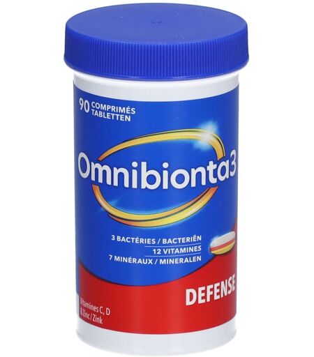 Complément alimentaire à utiliser dans le cadre d’une alimentation variée, équilibrée et d’un mode de vie sain.Contribuez au bon fonctionnement de vos défenses naturelles grâce à la nouvelle formule Omnibionta3® Defense – Soutien immunitaire1 qui vient de l’intérieur !La formule Omnibionta3 Defense a été spécialement conçue avec des minéraux et des vitamines, qui aident au maintien des défenses naturelles de l’organisme1.Chaque comprimé contient 12 vitamines et 7 minéraux, notamment de la vitamine C, de la vitamine D et du zinc pour favoriser le fonctionnement normal du système immunitaire1. La vitamine C et le fer contribuent en outre à réduire la fatigue1.Mais ce n’est pas tout ! Omnibionta3® Defense contient également des vitamines B2, B3 et B8 qui soutiennent les muqueuses2 ainsi que 10 millions de bactéries (L. gasseri, B. bifidum, B. longum) qui atteignent l’intestin vivantes.La dose recommandée pour les adultes (18+) est 1 comprimé par jour avec une boisson fraîche ou immédiatement après un repas.1. Les vitamines C, D et le zinc contribuent au fonctionnement normal du système immunitaire. La vitamine C et le fer contribuent à réduire la fatigue. 2. Les vitamines B2, niacine et biotine contribuent au maintien de muqueuses normales.BénéficesSOUTIEN IMMUNITAIRE1 QUI VIENT DE L'INTÉRIEUR : Complément alimentaire multivitaminé pour adultes avec minéraux et vitamines pour contribuer aux défenses naturelles de l’organisme1.FORMULE 3 EN 1 avec 3 bactéries, 12 vitamines et 7 minéraux. Des vitamines B2, B3 et B7 qui soutiennent les muqueuses. La vitamine C, la vitamine D et le zinc contribuent au fonctionnement normal du système immunitaire.AVEC DES BACTÉRIES : Chaque comprimé contient 10 millions de bactéries (L. gasseri, B. bifidum, B. longum) qui atteignent l’intestin vivantes.IngrédientsAgent de charge: cellulose microcristalline; vitamine C; oxyde de magnésium; agent d'enrobage: hydroxypropylméthylcellulose; amidon; dextrose; vitamine E; niacine; anti-agglomérants: mono- et diglycérides d'acides gras, dioxyde de silicium, sels de magnésium d'acides gras; stabilisants: polyvinylpyrrolidone, polyvinylpolypyrrolidone; agent d'enrobage: hydroxypropylcellulose; sirop de glucose; sulfate de fer; oxyde de zinc; amidon modifié; agent de charge: carboxyméthylcellulose sodique réticulée; vitamine B5; support: phosphate dicalcique; maltodextrine; émulsifiant: gomme d'acacia; vitamine B6; vitamine B1; sucre; vitamine B2; colorant: oxydes et hydroxydes de fer; souches bactériennes Lactobacillus gasseri PA 16/8, Bifidobacterium bifidum MF 20/5, Bifidobacterium longum SP 07/3 (traces de lait, poisson et soja); sulfate de manganèse; vitamine A (acétate de rétinyle); acide folique; épaississant: carboxy-méthylcellulose sodique; biotine; iodure de potassium; chlorure de chrome (III); sélénate de sodium; vitamine D; vitamine B12.Données nutritionnellesIngrédientPar compriméLactobacillus gasseri PA 16/8, B. bifidum MF 20/5, B. longum SP 07/310⁷ CFUVitamine A800... ...
