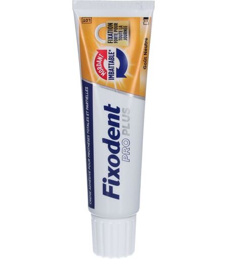 Fixodent Pro Plus est une crème adhésive spécialement conçue pour les porteurs de prothèses dentaires totales et partielles.Sa formule avancée garantit une fixation forte et durable, maintenant la prothèse bien en place.Elle aide également à prévenir l'infiltration de particules alimentaires sous la prothèse, pour un confort et une hygiène accrus. Nettoyer et sécher soigneusement la prothèse. Appliquer la crème en fines bandes ou en points sur les zones en contact avec les gencives. Placer la prothèse dans la bouche et appuyer fermement pendant quelques secondes. Attendre quelques minutes avant de manger ou de boire pour une adhérence optimale. Calcium/Zinc PVM/MA Copolymer (33 %), Paraffinum Liquidum, Petrolatum, Cellulose Gum (20 %), Silica, CI 45410, CI 15985, BHT, Tocopherol. ...