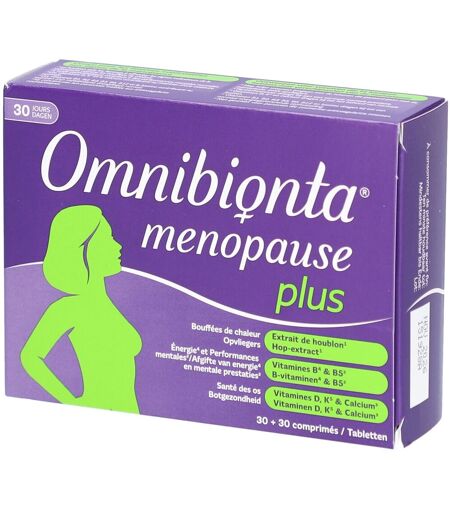 Complément alimentaire à utiliser dans le cadre d’une alimentation variée, équilibrée et d’un mode de vie sain.Omnibionta® Ménopause Plus est un pack combinant des comprimés à base d'extrait de houblon pour aider les femmes à faire face aux signes de la ménopause¹, tels que les bouffées de chaleur, ainsi que des comprimés de multivitamines et minéraux.Les comprimés de multivitamines et minéraux sont formulés avec des vitamines B pour aider à réduire la fatigue⁵, la vitamine B5 et le zinc pour soutenir les performances mentales² et les fonctions cognitives normales⁶, ainsi que les vitamines D, K et le calcium pour la santé osseuse normale⁴.Omnibionta® Ménopause Plus, complément alimentaire pour la ménopause, est une formule avec un extrait de plante¹. 3 mois d’utilisation conseillé Contenu :30 comprimés d'extrait de houblon sous blister et 30 comprimés de multivitamines et minéraux sous blister pour 30 jours afin de vous aider à rester calme et détendue pendant la ménopause¹. Bénéfices SOUTIEN EXTRAIT DE PLANTE1 POUR LA MÉNOPAUSE : complément alimentaire pour la ménopause conçu avec un extrait de houblon et des multivitamines pour aider les femmes à gérer les bouffées de chaleur1, soutenir leur métabolisme énergétique3 et leurs performances mentales2. SOUTIEN DES BOUFFÉES DE CHALEUR : complément alimentaire pour la ménopause conçu avec un extrait de houblon pour aider les femmes à gérer les signes de la ménopause, tels que les bouffées de chaleur1. ÉNERGIE3 : les vitamines B2, B3, B5, B6, B12 et la biotine soutiennent votre métabolisme énergétique, afin que vous vous sentiez active et maîtrisiez votre vie quotidienne, tant professionnelle que personnelle. SANTÉ DES OS : les vitamines D, K et le calcium contribuent au maintien d'os normaux4. FORMULE EXTRAIT DE PLANTE1 : Omnibionta® Ménopause Plus, complément alimentaire pour la ménopause conçu pour aider les femmes à gérer les bouffées de chaleur1 et d'autres signes de la ménopause2,3,4. SANS : SANS GLUTEN, SANS LACTOSE, SANS INGREDIENT DÉRIVÉ DU PORC, sans OGM (Organisme Génétiquement Modifié) CONTENU : Omnibionta® Ménopause Plus, complément alimentaire quotidien conçu pour aider les femmes à faire face aux signes de la ménopause¹, 30 comprimés d'extrait de houblon sous blister et 30 comprimés de multivitamines et minéraux sous blister pour une cure de 1 mois. 1 : Les deux produits contiennent un comprimé à base d'extrait de houblon. Le houblon aide les femmes à faire face aux signes caractéristiques associés à la ménopause, tels que les bouffées de chaleur. Allégation de santé en attente d'approbation par l'EFSA.2 : L’acide pantothénique contribue à des performances mentales normales. Le zinc, le fer et l'iode contribuent à une fonction cognitive normale.3 : Les vitamines B1, B2, B3, B5, B6, B12 , C , la biotine, le magnésium et le cuivre contribuent à un métabolisme énergétique normal. Les folates contribuent à réduire la fatigue.4 : Les vitamines D, K, le Manganèse et le calcium contribuent au... ...