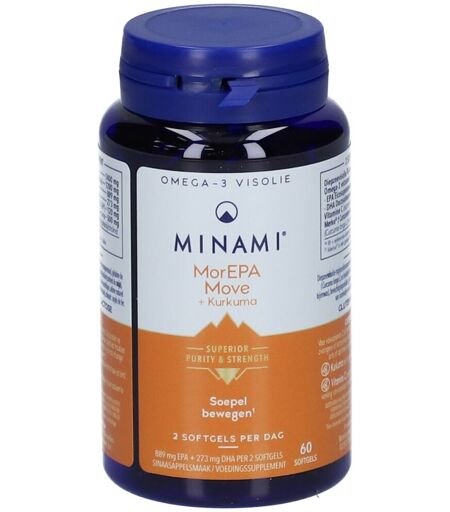 Complément alimentaire à utiliser dans le cadre d’une alimentation variée, équilibrée et d’un mode de vie sain.MorEPA Move est une formulation de Minami combinant de l’oméga-3 hautement dosé (90%) (445 mg EPA + 136 mg DHA) avec du curcuma, de la vitamine C.Le curcuma contribue au maintien de la souplesse des articulations et aux os normaux*.La vitamine C contribue à la formation normale de collagène pour assurer la fonction normale du cartilage et des os.EPA et DHA contribuent:au fonctionnement normal du cœur avec un apport quotidien d’au moins 250 mg d’EPA + DHA (1 softgel/jour)DHA contribue:à conserver une vue et une fonction cérébrale normales avec un apport quotidien de 250 mg de DHA (2 softgels/jour)Contenu: 60 softgelsIngrédientsConcentré de TG d’huile de poisson de haute mer (d’anchois, de sardines et de maquereaux), gélatine de poisson, extrait de curcuma (Curcuma longa L.) et complexe de phosphatidylcholine (contient du soja) humectant: glycérol, acide ascorbique, stabilisateur : lécithine de tournesol, stabilisateur : cire d’abeille, arôme naturel d’orange, antioxydant?: mélange d’extraits de romarin et de tocophérols (Miradoxan), colorant : oxyde de fer.Données nutritionnelles1 softgel contient:Concentré d’huile de poisson de haute mer 700 mgAcides gras oméga-3 (TG) 640 mg- EPA Acide eicosapentaénoïque 444 mg- DHA Acide docosahexaéonique 136 mg- Autres acides oméga-3 60 mgVitamine C (acide ascorbique) 60 mgMeriva® Curcumine Phytosome 250 mg(Extrait de curcuma (Curcuma longa L.)(rhizome) & complexe de phosphatidylcholine)Conseils d'utilisationsPour adultes 2 softgels par jour, avec un repas.Précautions d'emploiTenir hors de portée des enfants.Ne pas dépasser la dose recommandée.FabricantMinamiBirminghamstraat 2211070 BrusselBelgique ...