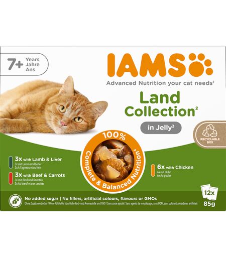 IAMS Advanced Nutrition Senior 7+ Land Collection en gelée a été spécialement conçu pour répondre aux besoins des chats âgés. Les bouchées juteuses dans une gelée moelleuse n'offrent pas seulement un plaisir délicieux, elles sont également pleines... ...
