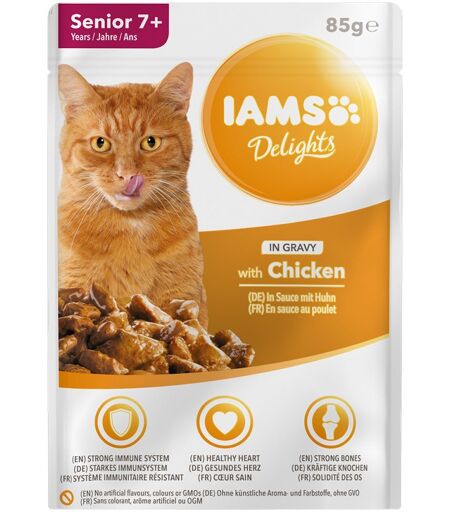Les sachets fraîcheur IAMS Mature Senior offrent une nourriture complète et équilibrée qui répond aux besoins spécifiques des chats senior à partir de 7 ans. Un ragoût excellent dans une petite sauce allie alimentation saine et saveur délicieuse. Les sachets fraîcheur IAMS Mature Senior riches en poulet se basent sur les mêmes principes nutritionnels que les autres produits Iams : teneur élevée en protéines animales de qualité qui aident à obtenir une bonne masse musculaire et protègent les... ...