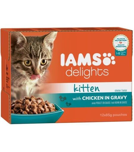 IAMS Delights Humide Poulet en sauce - Toutes Races - 12x85 g - Pour chaton - IAMS Delights est un aliment de qualité 100% complet et équilibré pour chaton. Une nutrition complete et un goût irrésistible. - Général : - Marque : IAMS - Type de produit : Complément nutritionnel - ... ...